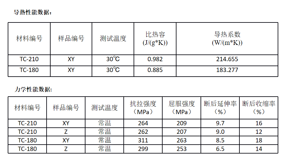 导热性能较传统材料大幅提升:TC-210导热率较AlSi10Mg提升40%-60%,TC-180导热率较AlSi10Mg提升30%-40%。