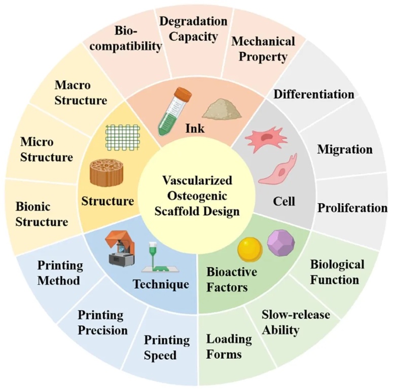 血管化骨修复支架的设计策略:该图展示了血管化骨修复支架的设计策略,涵盖打印技术、墨水、生物活性因子、支架结构等方面。打印技术包括光基和喷嘴基等多种技术,墨水需具备多种特性,生物活性因子影响支架功能,支架结构设计涉及孔隙和管道结构,这些要素相互关联,共同影响支架性能。