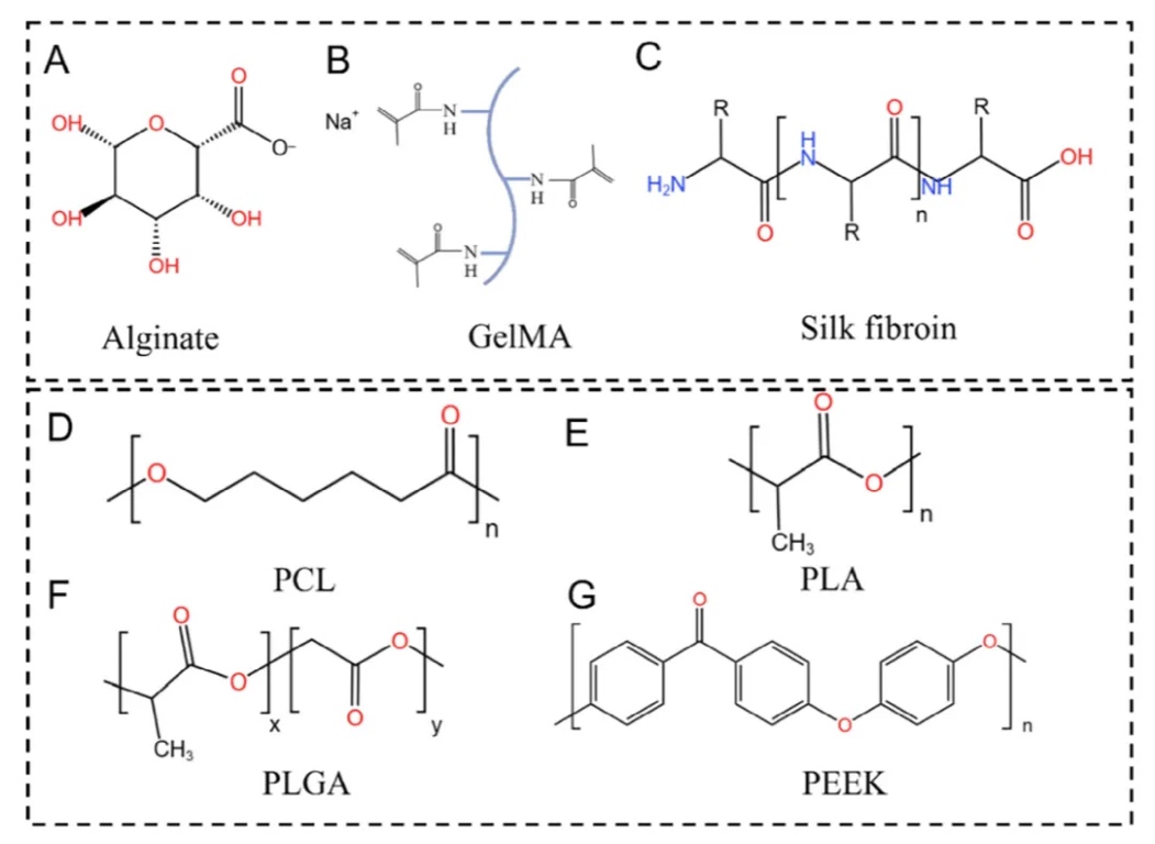 部分打印墨水的化学结构式:展示了藻酸盐、GelMA、丝素蛋白、PCL、PLA、PLGA和聚醚醚酮等打印墨水的化学结构。这些墨水具有不同的特性,在3D打印血管化骨修复支架中,其结构决定了支架的性能,如生物相容性、机械性能、降解性等,影响着细胞的生长、黏附和分化。