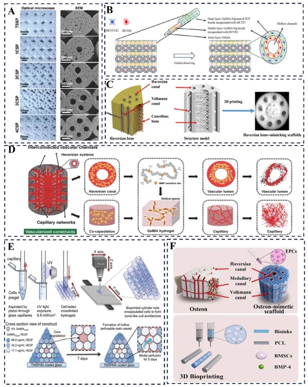 6. 血管化骨修复支架的管结构设计:呈现了多种管结构设计,如不同数量通道的空心纤维构成的支架、细胞负载的空心管结构、仿生哈弗斯管和伏克曼管的支架等。这些管结构可促进营养物质运输和血管生成,模拟天然骨血管结构,有助于提高支架修复骨缺损的效果。