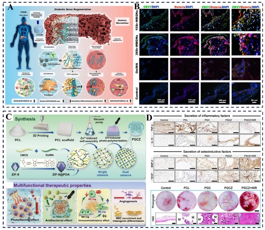 血管化骨修复支架在糖尿病性骨缺损中的应用:展示了血管化骨修复支架在糖尿病性骨缺损治疗中的应用,包括具有光热治疗活性的软硬结合系统、修复支架的设计与制备以及体内修复效果。这些支架通过改善局部微环境,促进血管生成和骨再生,为糖尿病性骨缺损的治疗提供了新的解决方案。