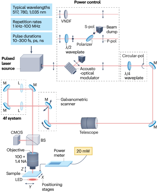 △MP3DL的典型设置:该设置由一个超短脉冲激光源、功率控制(显示三种可能的方法:可变中性密度滤光片(VNDF);波片与偏振器的组合;以及声光调制器的使用)、一个测量单元(功率计)、一个偏振控制单元、一个望远镜、用于束光的物镜、定位台或伽伐尼扫描仪、样品照明单元和一个互补金属氧化物半导体(CMOS)相机组成。BS,光束分splitter;L,透镜;M,镜子;MP3DL,多光子3D光刻;NA,数值孔径。