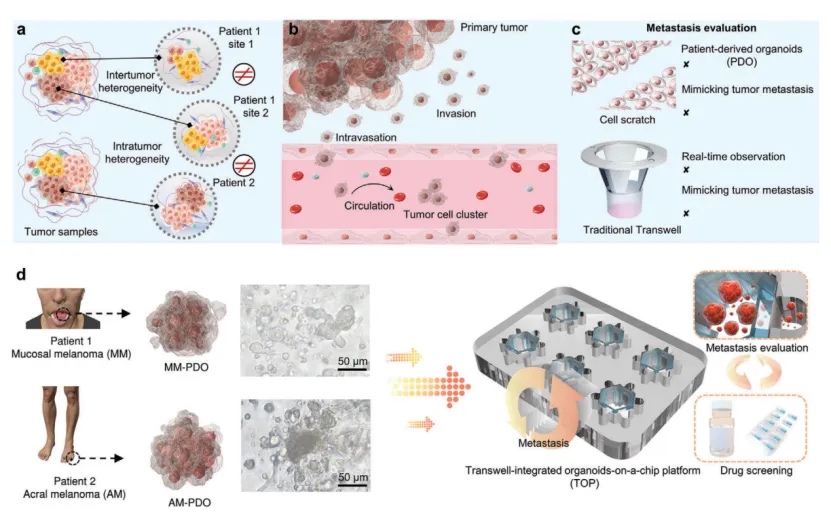 中南大学湘雅医院皮肤科、中南大学机电工程学院、重庆大学三峡医院等研究团队了一种用于评估肿瘤转移性的肿瘤类器官芯片。该芯片可以模拟人体内肿瘤生长和转移的生理过程,能够有效评估患者肿瘤细胞的侵袭能力和生长能力。