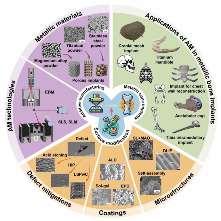 表面改性技术对于提高骨-植入体界面的力学性能和生物相容性至关重要。通过粉末床熔融等增材制造(AM)技术,不锈钢、钛和可降解合金等金属生物材料,可用于制造适合颅面、躯干和四肢骨重建的植入体。后续的喷砂、化学处理常用于改善植入体的表面特性,而功能性涂层和微纳结构不仅提升了植入体与骨组织的机械和生物相互作用,还有助于控制药物释放和增强抗菌性能。