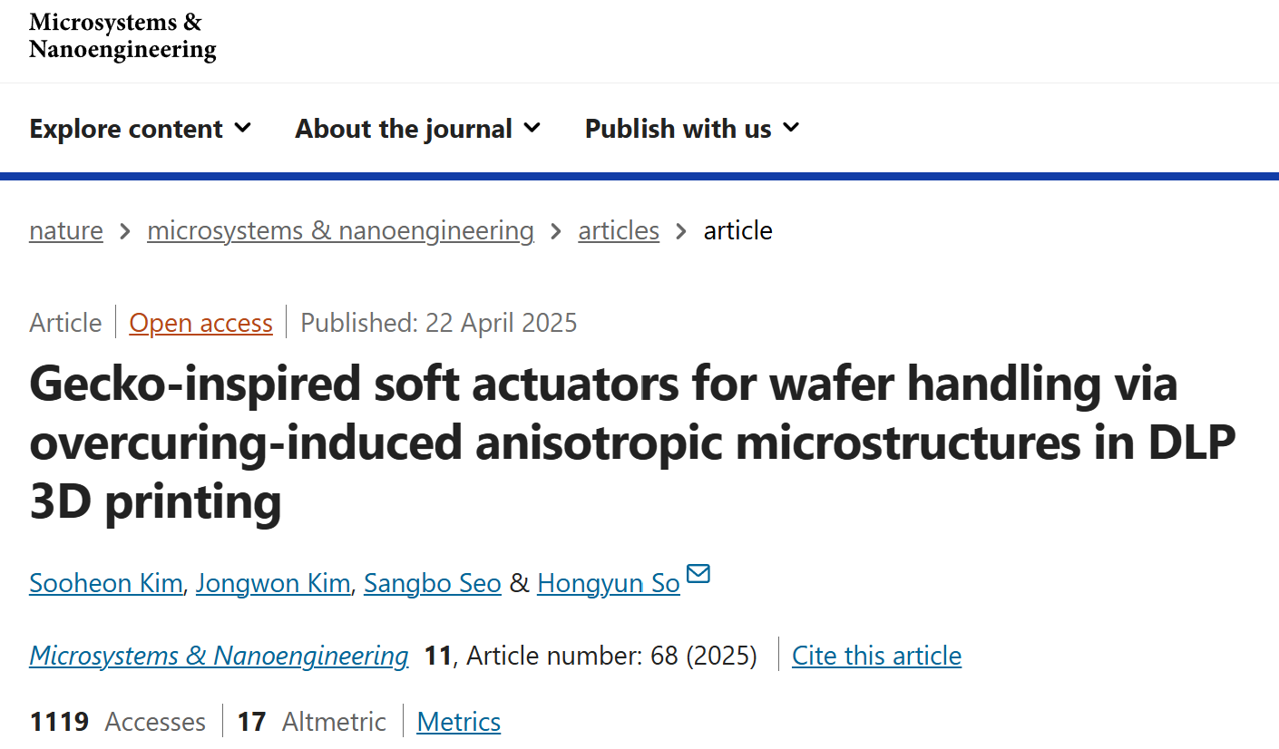 3Dprinting”的论文发表于《微系统与纳米工程》(2025年4月),改进了晶圆处理性能,并有望在软体机器人和生物医学领域获得更广泛的应用。