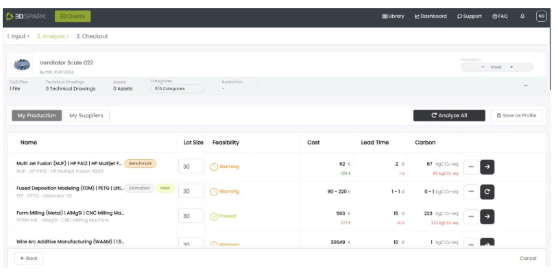 Spark通过人工智能技术整合产品设计、制造工艺和采购管理三大环节,为企业提供端到端的数字化决策支持。核心优势在于兼容超过15种增材制造与传统工艺(涵盖金属/聚合物/陶瓷材料),可实时进行可制造性评估、成本核算、供应商比价及碳足迹分析,帮助西门子交通、德国铁路等全球巨头缩短采购周期30%-50%,平均降低零部件成本15%。