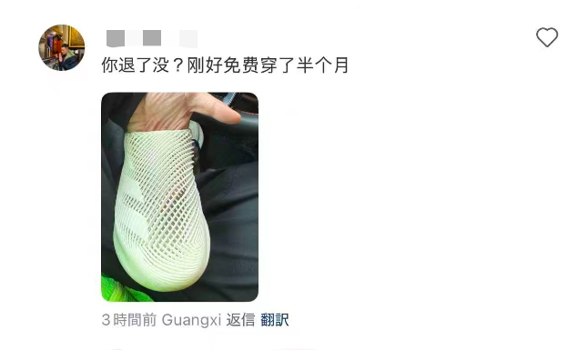 在某红书上,南极熊发现了多名购买者反应,穿着以后鞋面出现了不同程度的破损,南极熊认为,应该是鞋面支撑性不足,穿着后网眼区域易变形或撕裂,尤其是鞋头弯折处易出现磨损破裂 ,根据使用者上传破损图片显示,破损处基本上集中在鞋面折弯出。