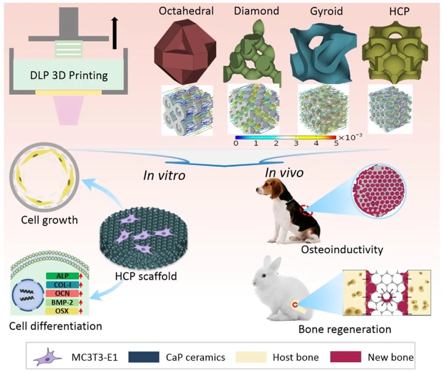 四川大学国家生物医学材料工程技术研究中心张兴栋院士、朱向东研究员、李向锋副研究员团队,通过优化孔隙架构来提升3D打印CaP陶瓷的骨诱导性。团队制备了具有六方密堆积(HCP)球形孔结构的CaP陶瓷,并构建了八面体、菱形和螺旋形结构作为对照。研究系统地探究了不同孔隙架构对陶瓷的结构、力学性能、渗透性以及细胞行为和体内骨诱导性的影响。相关工作以“3D