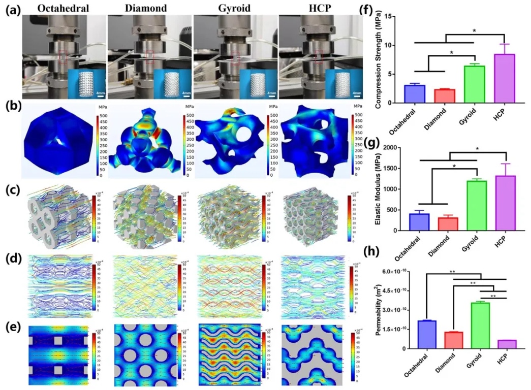 运用有限元分析和数值流体流动分析方法,结合万能材料试验机测试,研究不同孔隙结构CaP陶瓷的力学性能和渗透率。结果显示,HCP结构的CaP陶瓷压缩强度和弹性模量最高,应力分布更均匀;其流体流速和渗透率在四种结构中最低,螺旋形结构的渗透率最高。同时,孔隙几何结构对陶瓷烧结收缩率影响较小,八面体、螺旋形和HCP结构的比表面积无显著差异,菱形结构比表面积较低。
