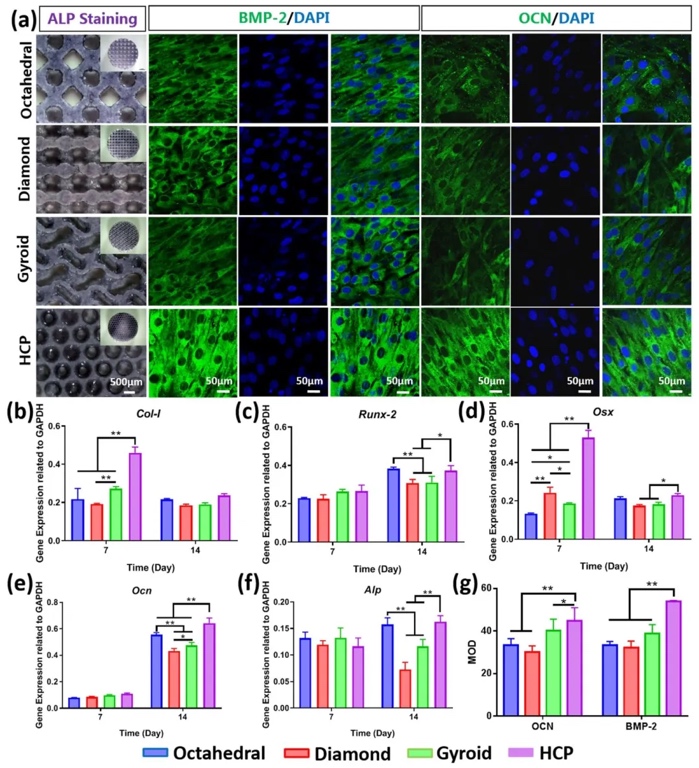 对在不同孔隙结构CaP陶瓷上培养7天的MC3T3-E1细胞进行ALP染色,对培养14天的细胞进行OCN和BMP-2免疫荧光染色,采用实时定量逆转录PCR分析细胞培养7天和14天时相关成骨基因的表达,研究不同孔隙结构CaP陶瓷对细胞骨向分化的影响。结果显示,HCP组的ALP活性相对较高,能显著促进BMP-2和OCN的高水平表达,且在成骨基因(Col-I、Runx-2、Osx、Ocn和Alp)表达上表现更优。