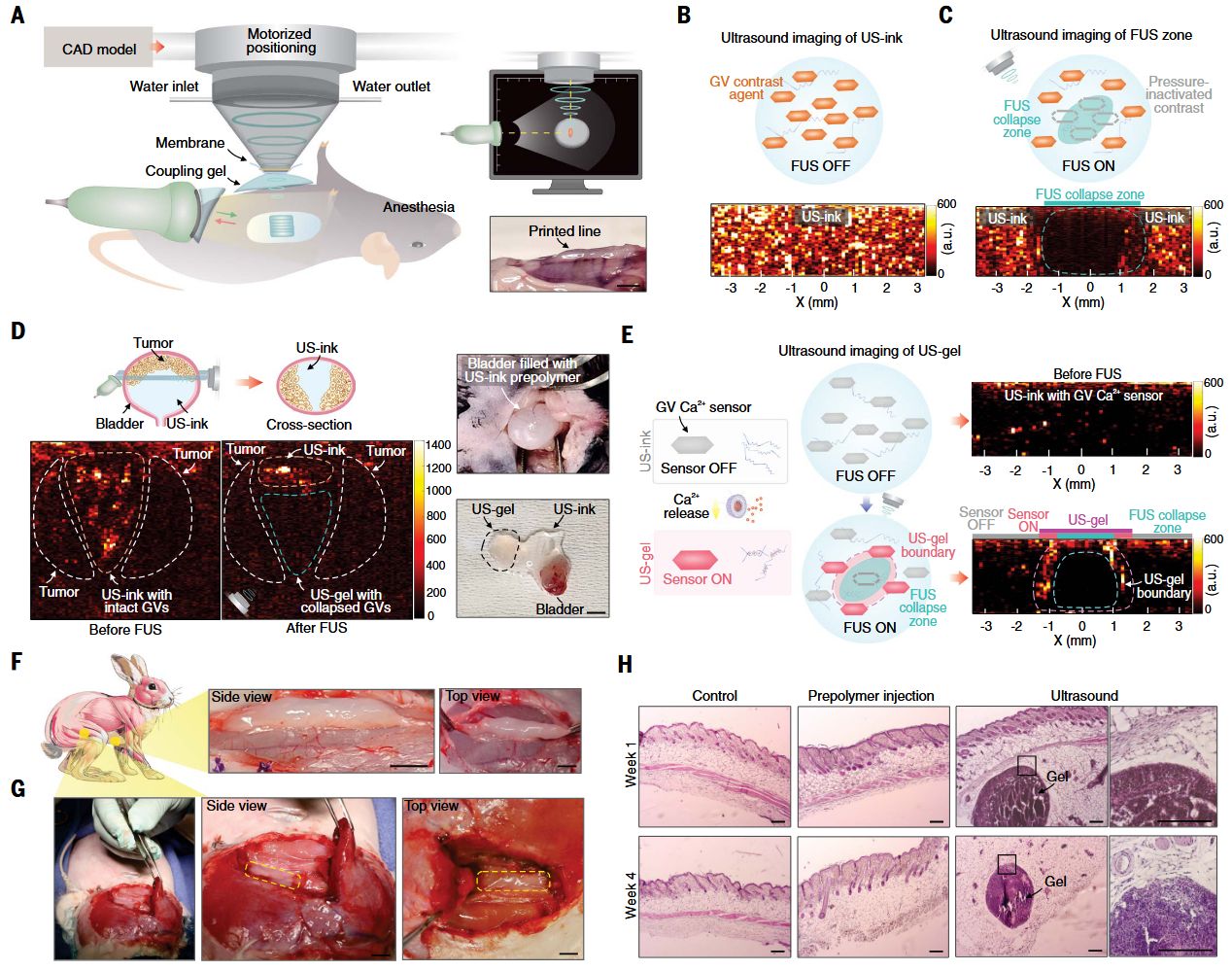 冷冻干燥的3D打印藻酸盐超声凝胶的扫描电子显微镜图像。比例尺,20微米。(E) 用声音在体内打印的功能性水凝胶结构。比例尺,5毫米。(F至H)