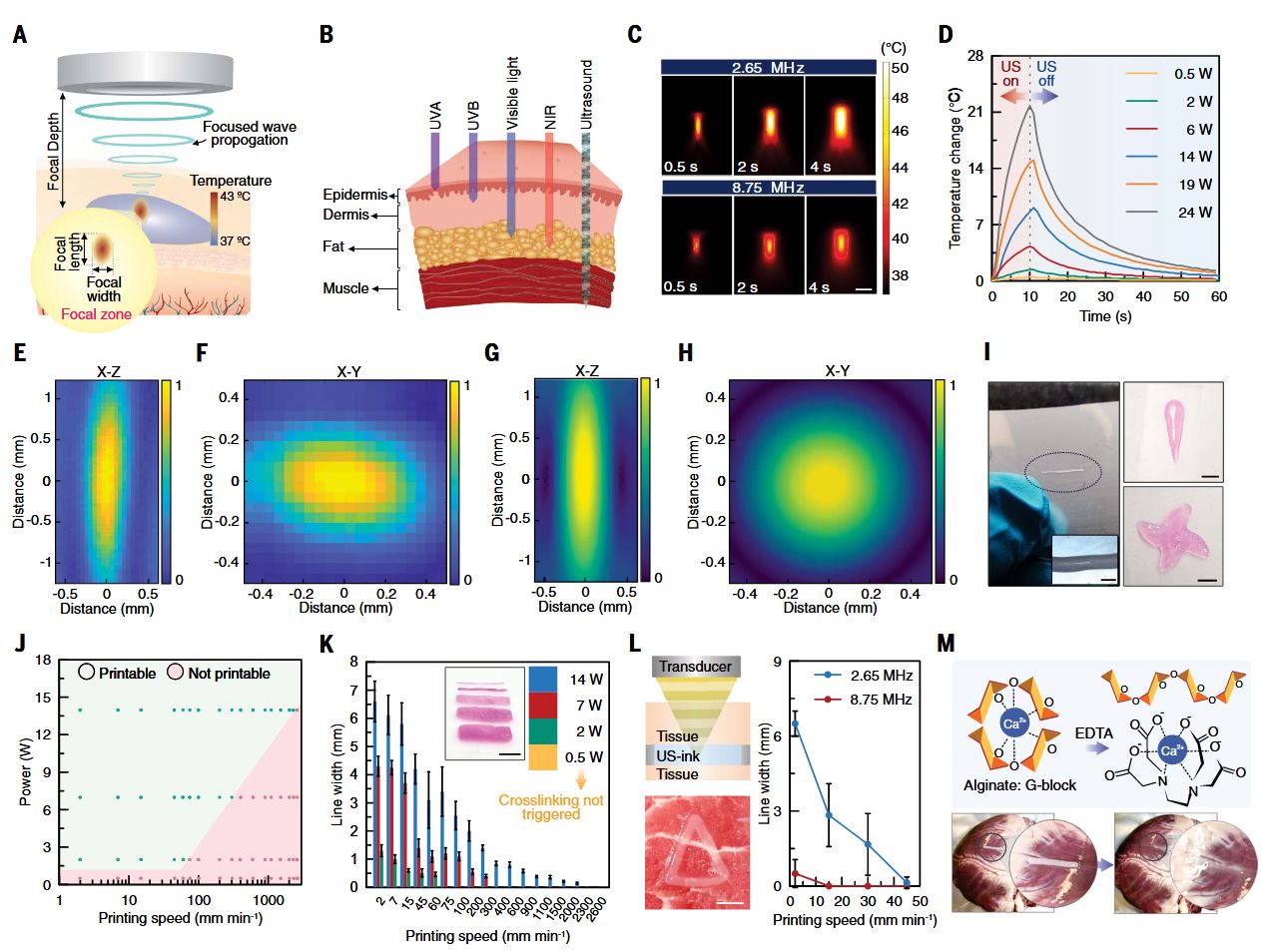 在不同功率水平和打印速度下,使用8.75MHz换能器的藻酸盐超声墨水可打印性。(K)