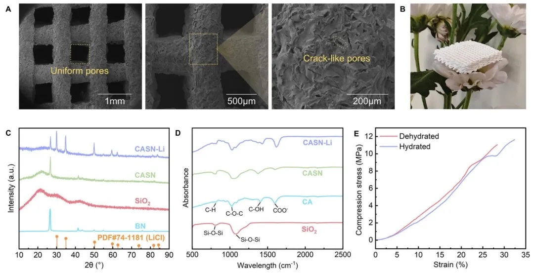 CASN-Li整体材料的表征,运用SEM、X射线衍射仪(XRD)、傅里叶变换红外光谱仪(FTIR)和动态力学分析仪(DMA)等手段,研究了CASN-Li整体材料的微观形貌、物相组成、官能团以及压缩性能。结果显示,材料表面粗糙且有裂纹状微孔,存在BN等成分,含有丰富的含氧官能团,具有良好的亲水性,在脱水和水合状态下都能承受较高的压缩应力,结构稳定。
