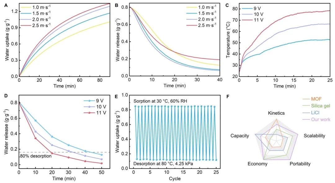 m/s、加热电压11 V时,材料能快速释放水分,25次循环测试中无泄漏和结构损坏,且在经济、可扩展性等方面具有优势。