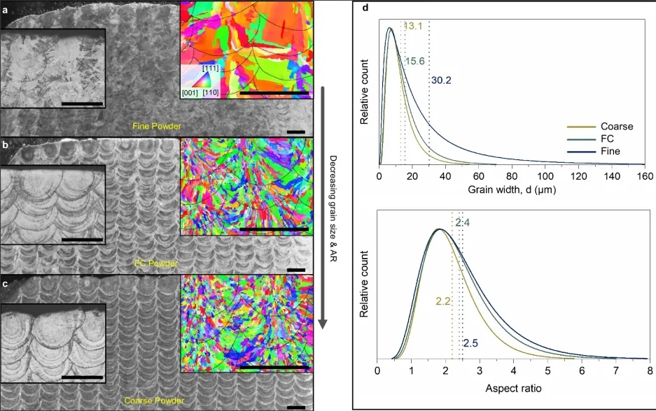 该项工作不仅证明了颗粒原料的粉末粒度对AM微观结构的影响,而且还探索了它可以产生特定位点的微观结构控制,实现了对晶粒微观结构的简单控制,即几乎无法实现的晶粒形态和尺寸的广谱控制。