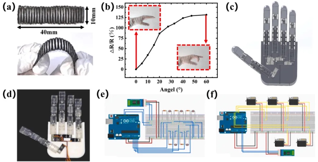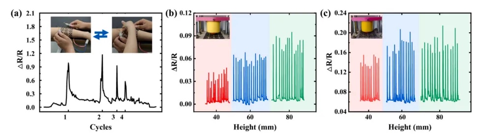 (2)基于手形超材料的柔性传感器成功应用于人体肘部运动监测,验证其在运动追踪场景的实用性,拓展了可穿戴设备的传感维度。