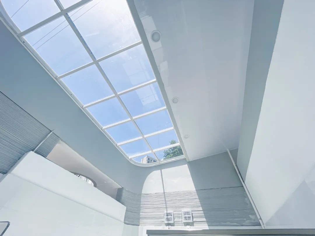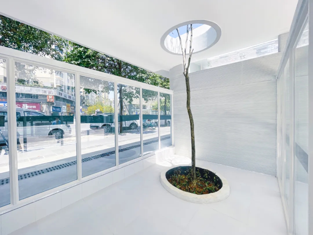 项目以“红旗印象”为核心理念,采用白色极简风格勾勒建筑轮廓,将本土风貌符号转化为现代建筑语言。尤为巧妙的是,建筑中心巧妙保留场地原有的树木,以天井形式构成生态核心,既守护了生态记忆,又赋予建筑灵动光影。