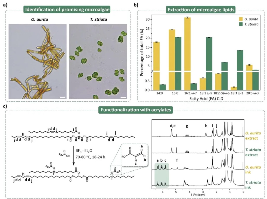 striata两种富含脂质的微藻,对其提取物进行功能化处理,得到可直接用于打印的墨水。该墨水以微藻中的叶绿素衍生物作为光引发体系,避免了使用非生物基和有毒的光引发剂。通过实验,团队研究了墨水的打印窗口、固化、分辨率等性能,并验证了3D打印结构的生物相容性。