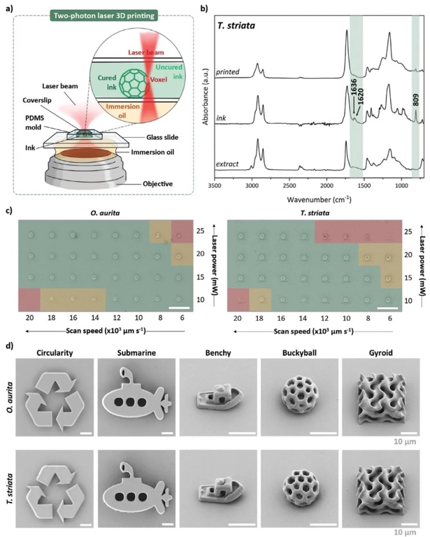 本研究证实了微藻作为独特且可持续的“生物工厂”,在开发适用于双光子3D激光打印的生物相容性材料方面的可行性。研究选取的O. aurita和T.
