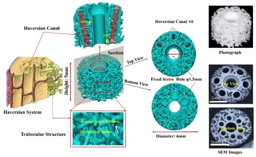 来自北京航空航天大学生物与医学工程学院樊瑜波教授团队利用数字光处理(DLP)增材制造技术,创新性地设计并制备出具有哈弗斯管和小梁多孔结构的3D打印玻璃陶瓷支架(3DP)。团队对3DP的形貌、微观结构、元素组成和机械特性进行研究,并与牛异种骨块(XBB)、人同种异体骨块(ABH)和兔自体骨块(ABR)对比,还通过兔颅骨模型评估它们的垂直成骨能力。相关工作以“Enhanced