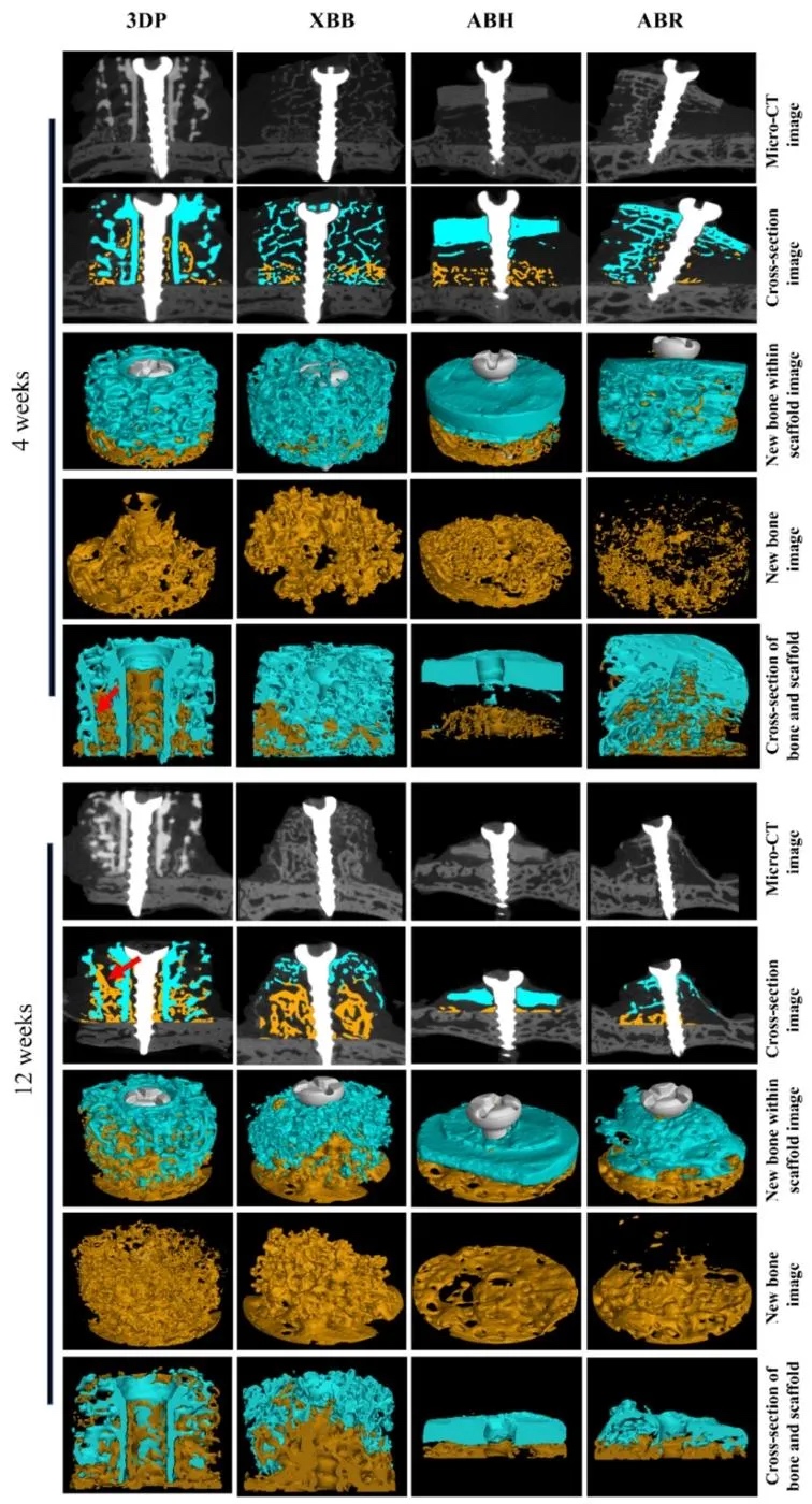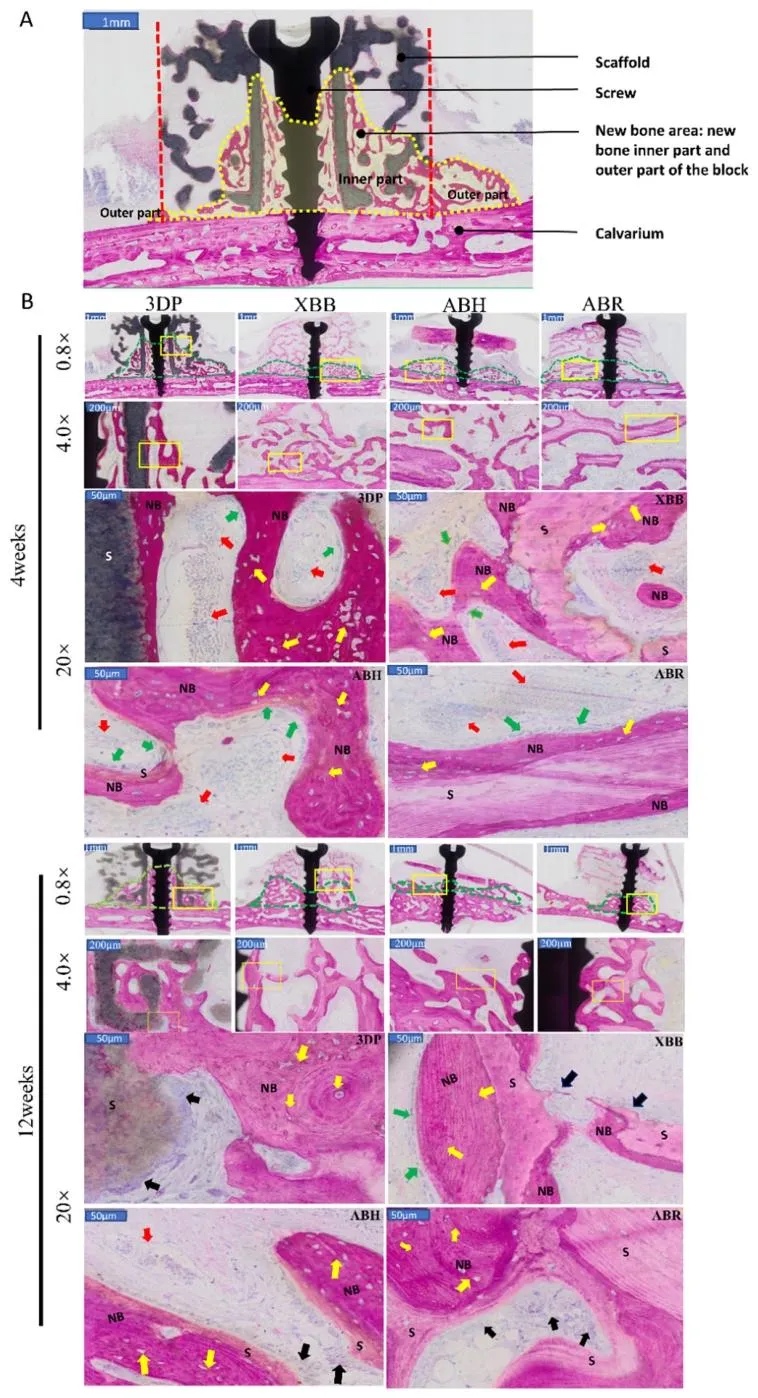 ,3DP早期垂直成骨更快;组织学分析显示,所有骨块均与宿主骨整合,但3DP新骨呈定向生长,且在4周时新骨面积显著高于XBB和ABH。