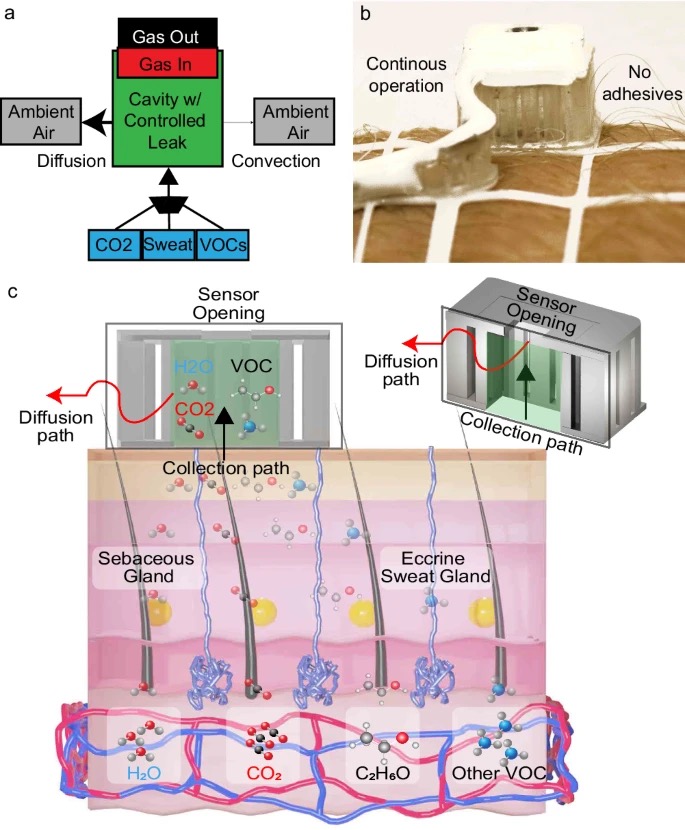 阿尔伯塔大学生物医学工程副教授、BIO5研究所成员Philipp Gutruf表示:“传统的可穿戴健康监测设备通常依赖于通过粘合剂直接贴合皮肤的传感器,但皮肤表层会不断更新、脱落,导致数据采集的连续性和可靠性受限。”团队研究员David Clausen进一步指出:“我们开发的设备通过追踪皮肤释放的气体,有效绕过了传统设备粘附不稳、传感器堵塞等问题,实现了真正意义上的非侵入式、连续监测。”