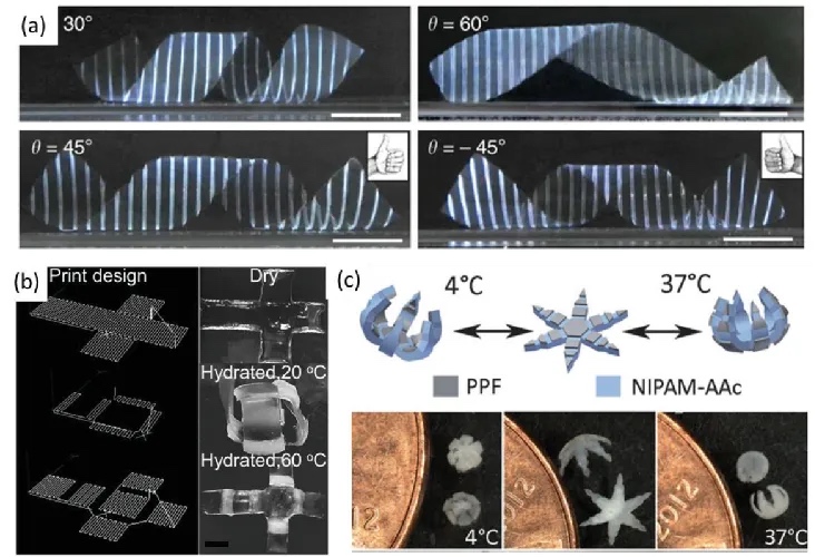 异丙基丙烯酰胺脱水温度)及氯化钠水溶液中可进行平面与螺旋形态的可逆转变,且螺旋形态随与薄片长轴角度变化而改变。图9(b)是打印的复合水凝胶薄片含刺激响应性铰链,其可逆转变为立方体盒子,呈现由水合作用和温度变化引发的折叠