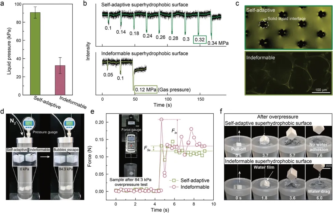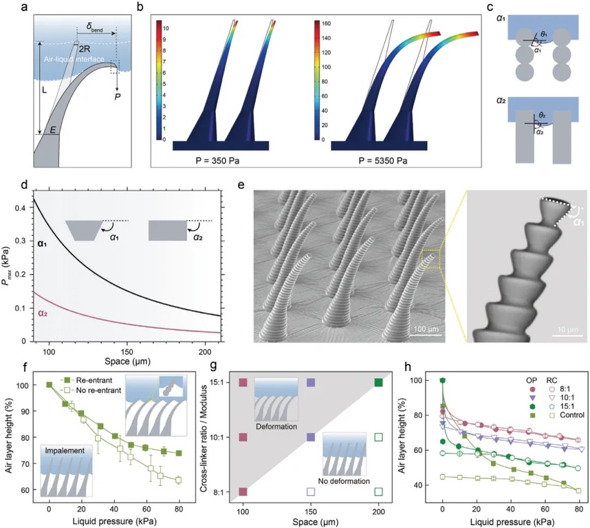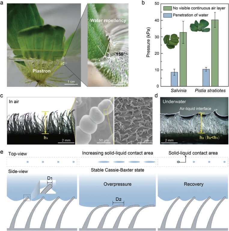 针对上述问题,电子科技大学基础与前沿研究院邓旭教授、王德辉教授团队观察到水生植物大薸的叶片具有优异的超疏水性,并展现出较好的抗水压能力和低的固—液粘附,这一特性归因于叶片绒毛状微结构的自适应形变及其表面独特的内凹几何特征。在水压作用下,这些微结构会发生形变,通过增加固—液接触面积来提升抗水压能力;而内凹特征提高了微结构表面的临界抗刺穿压力,确保其在高水压下进入形变抗压模式。同时,内凹几何特征提高了微结构的形变阈值,可促进高模量微结构形变响应,有利于形变后的气层恢复,使固—液粘附力始终保持在较低水平。基于上述原理,研究团队发展了仿生自适应超疏水表面的设计策略,其抗水压性能提高了约183%,受压后的粘附力降低了约80%。该项研究成果以“Superhydrophobicity