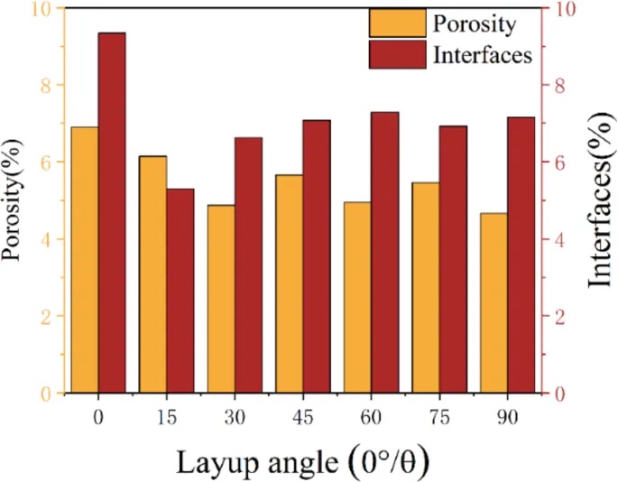 铺层方式(图1c)及界面特性(图1b中黄/红色界面)对材料刚度的影响。通过分析微观结构(如纤维排列、孔隙形状、层内/层间界面结合)与宏观力学性能的映射关系,揭示了层厚增加导致的孔隙率上升、偏移铺层对孔隙填充的优化(图8-9),以及界面粘结强度对剪切模量的调控机制(图5)。