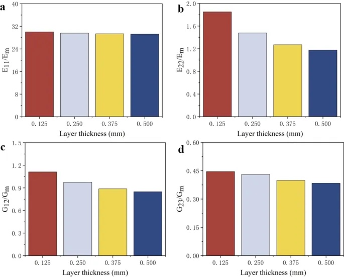 研究表明,打印层厚是影响3DP-CFRPCs弹性性能的核心因素:层厚从0.125 mm增至0.5