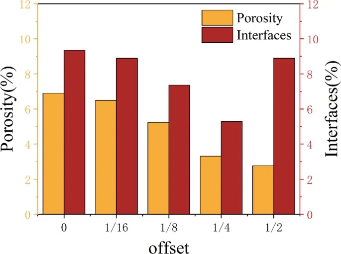 mm时,横向拉伸模量下降15%-20%,主要归因于孔隙率上升(实验与模型误差<6%)及层间聚合物扩散结合弱化。界面性能对剪切模量调控显著,界面粘结强度提升1.5倍可使纵向剪切模量增加25%。偏移铺层技术(如1/8丝宽偏移)通过优化孔隙填充和界面接触,使横向拉伸模量提升12%,而离轴铺层中45°铺层因纤维交错增强应力传递,剪切模量较0°铺层提高18%。
