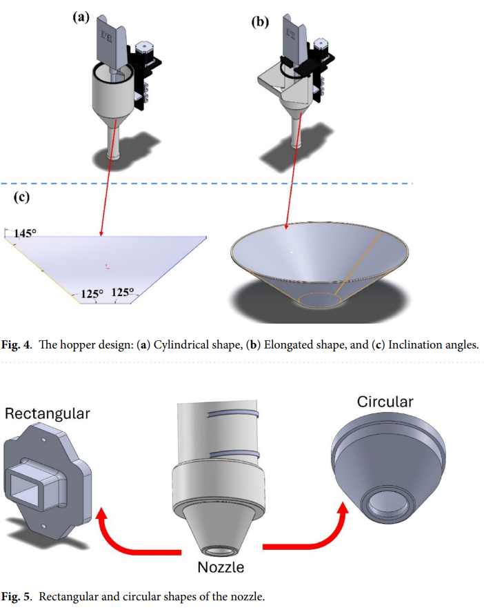 这套建筑3D打印系统的核心在于挤出装置,包括料斗、螺旋送料器和可互换的喷嘴。研究团队对这些关键部件进行了重新设计,以适应水泥基复合材料的特性。他们设计的螺旋送料器长600毫米,螺距48毫米,能够在保证送料率的同时提高挤出精度。而且还开发了矩形和圆形两种不同形状的喷嘴,以满足不同建筑结构的需求。测试显示,矩形喷嘴在打印稳定性和层间粘合方面表现更佳,能够稳定堆叠多达12层,而圆形喷嘴最多只能稳定堆叠8层。