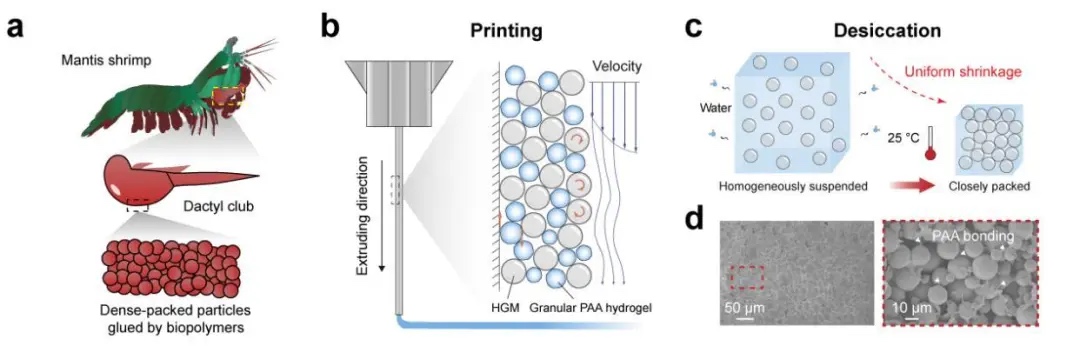 HGMs)的复合材料,模拟了致密的生物矿化层结构。PAA颗粒水凝胶作为剪切滑动相改善了墨水流动性,同时其收缩特性有助于提高最终复合材料的结构分辨率和填料密度。该策略为充分利用功能填料的性质,创造高性能三维复合材料开辟了新的途径,并有望应用于微电子器件热管理、高密度固态电解质、高比表面积催化剂等领域。