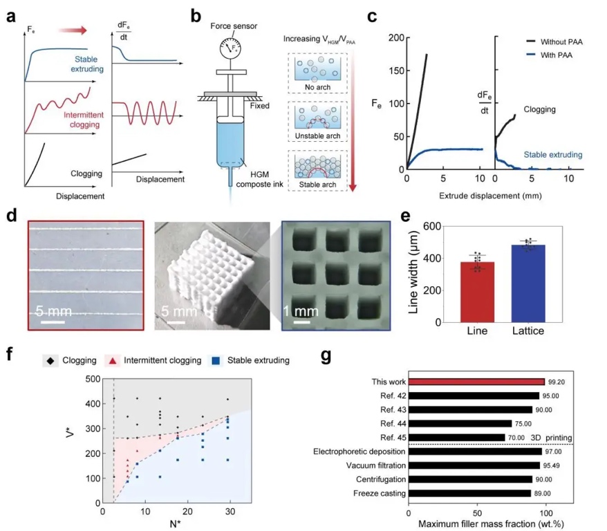 研究人员系统研究了复合墨水的打印性能和影响因素(图2)。通过引入PAA颗粒水凝胶,即使HGMs的质量分数高达99.2 wt.%(体积分数99.7