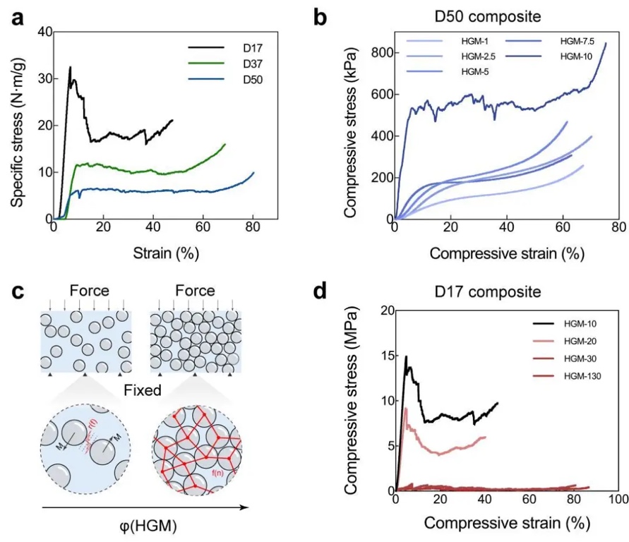 随后,研究团队对打印成型的超高填料复合材料的力学性能进行了表征(图3)。结果表明,复合材料的力学行为(如比强度和压缩力学行为)受到HGMs的粒径以及HGMs与PAA比例的影响。使用较小粒径HGMs的复合材料展现出更高的比强度。随着HGMs含量的增加,复合材料的压缩行为从主要由PAA聚合物滑移主导转变为由HGMs颗粒间形成的力链网络主导(图3c)。然而,当HGM含量过高时,由于聚合物基体不足以有效粘结HGM,材料力学性能反而下降(图3d)。ysh图片3.jpg
