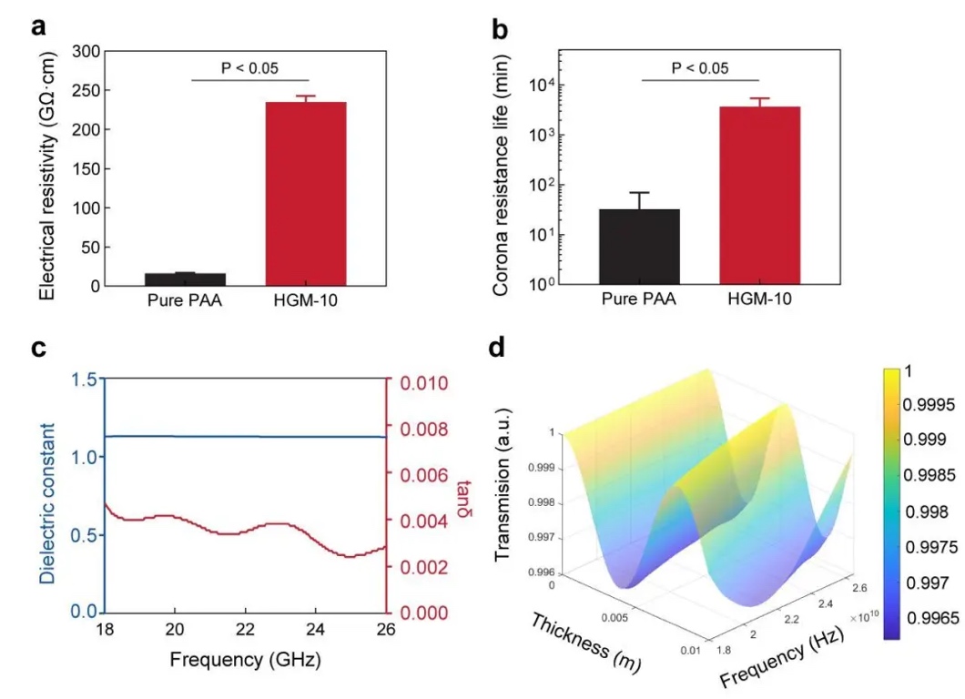 此外,所制备的HGM/PAA复合材料还表现出优异的电磁性能(图4)。与纯PAA材料相比,引入高含量HGM的HGM-10复合材料的体积电阻率提高了14倍,并且其耐电晕寿命也得到显著延长。在18~26