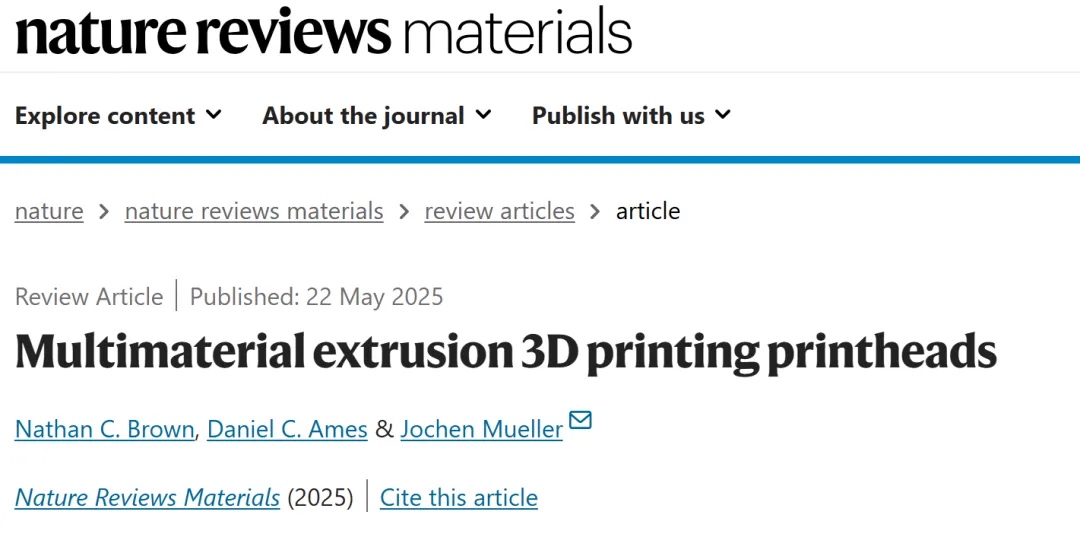 Mueller合作,全面探讨了喷头技术在材料挤出3D打印系统中的核心作用及其最新进展。系统总结了喷头技术如何通过多功能设计突破传统制造限制,并为复杂材料组合和高精度结构提供了全新解决方案。相关论文以《多材料挤出3D打印喷头》为题,发表在《自然综述:材料》(Nature