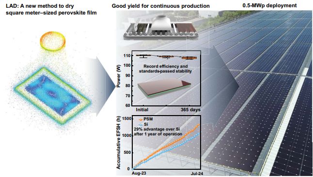为了评估LAD技术生产的钙钛矿太阳能组件在实际应用中的表现,研究团队在中国衢州的一个屋顶分布式光伏系统中安装了总计523.8千瓦峰值功率的钙钛矿组件,并与同一地点的硅基太阳能组件(总计4893千瓦峰值功率)进行了为期一年的并行发电性能对比。结果显示,在实际运行条件下,单位装机容量的钙钛矿太阳能组件年发电量比硅基太阳能组件高出29%。经过一年运行,该批钙钛矿组件的功率衰减率低于2%,初步估算的T90寿命(功率衰减至初始值90%的时间)可达9年。