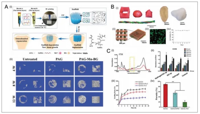 修复骨软骨缺损的示意图。(B) PEG-SA-纳米黏土水凝胶的3D生物打印。(i)
