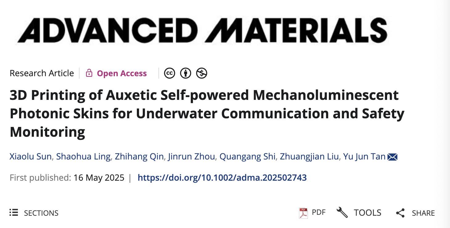 2025年6月1日,新加坡国立大学机械工程系的研究人员开发了一种突破性的3D打印光子皮肤材料。该材料具备膨胀、自供电、机械发光(ML)等特性,专为水下通信与安全监测设计。