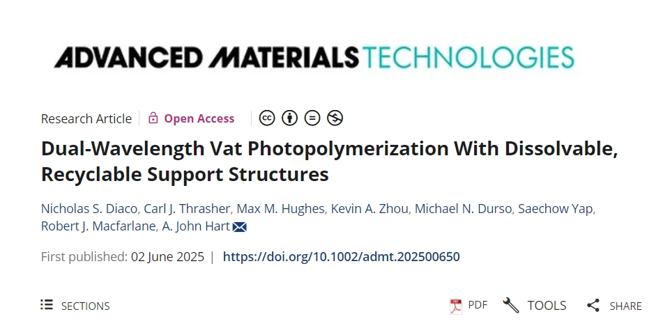 2025年6月3日,麻省理工学院(MIT)的工程师们开发了一种新的光固化3D打印树脂材料,根据照射的光类型不同,树脂能够变成两种不同的固体。紫外光(UV light)照射会将树脂固化为高弹性固体,而可见光(visible light)照射会将同一种树脂变成易溶于某些溶剂的固体。研究团队将新树脂同时暴露于紫外光图案和可见光图案中,紫外光图案形成坚固的结构,可见光图案形成结构的支撑物。打印完成之后,无需手动拆除支撑物,只需将打印材料浸入溶液中,即可溶解支撑物,露出坚固的紫外光打印部件。这种打印方式有点类似于双喷头打印,一个喷头打印零件,另一个喷头打印水溶性支撑。