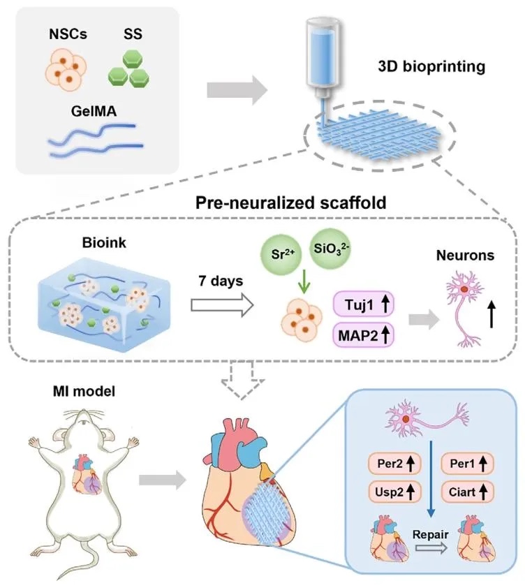 预神经化支架的设计制备及其用于梗死心肌修复的示意图。由于硅酸锶的作用,3D 生物打印支架中的神经干细胞被诱导分化为成熟神经元。将预神经化支架植入心肌梗死大鼠体内后,其通过调控昼夜节律相关基因,加速了梗死心肌的修复。