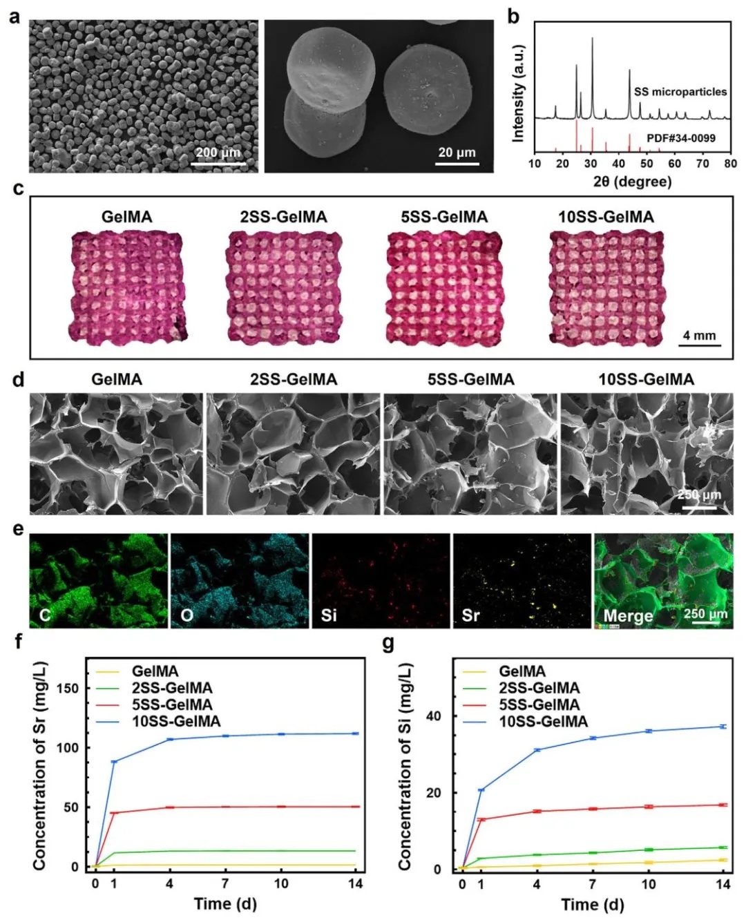 硅酸锶微粒子及3D打印支架的表征,通过扫描电子显微镜(SEM)、X射线衍射(XRD)、流变学分析和离子释放实验等方法,研究了不同浓度硅酸锶(SS)微粒子(0%、2%、5%、10%)的形貌、物相、生物墨水打印性能及Sr/Si离子释放规律。结果表明,SS微粒子呈六方棱柱形,5SS-GelMA支架兼具良好打印性和离子释放稳定性,Sr/Si离子在7天内基本完全释放,与神经干细胞(NSCs)分化时间窗匹配。