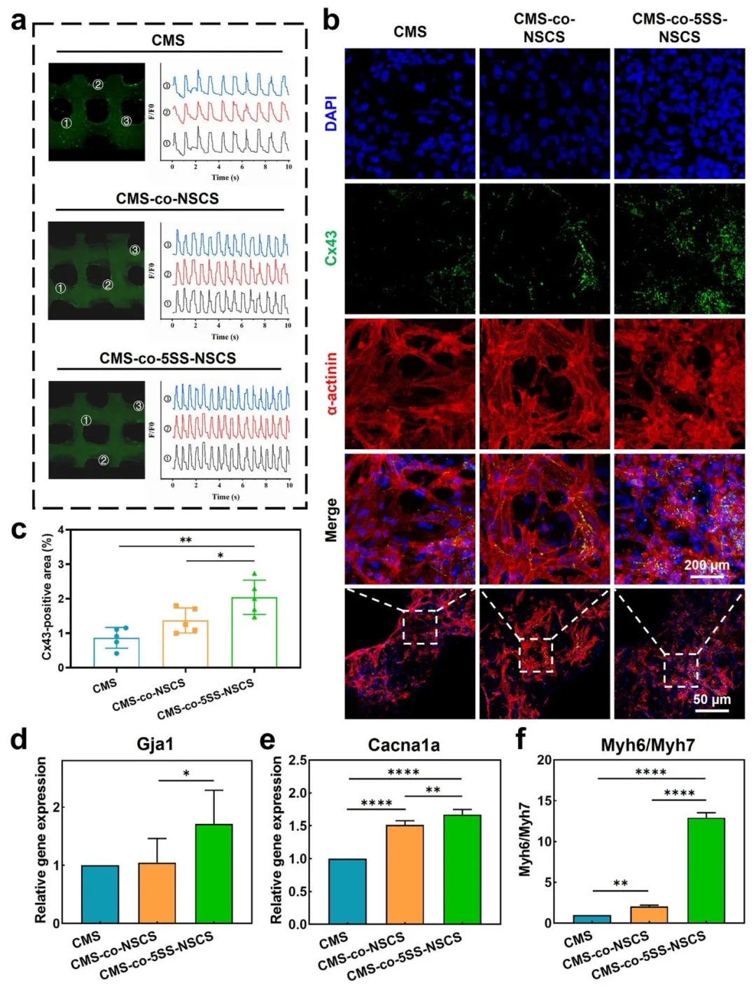 预神经化支架对心肌构建体的体外作用,通过钙瞬变实验、免疫荧光染色和基因表达分析,研究了预神经化支架与心肌细胞共培养时的功能调控。结果显示,5SS-GelMA-NSC支架显著增强心肌细胞搏动同步性(钙信号同步化)、连接蛋白Cx43表达及收缩相关基因(Myh6/Myh7)活性,促进心肌结构成熟。