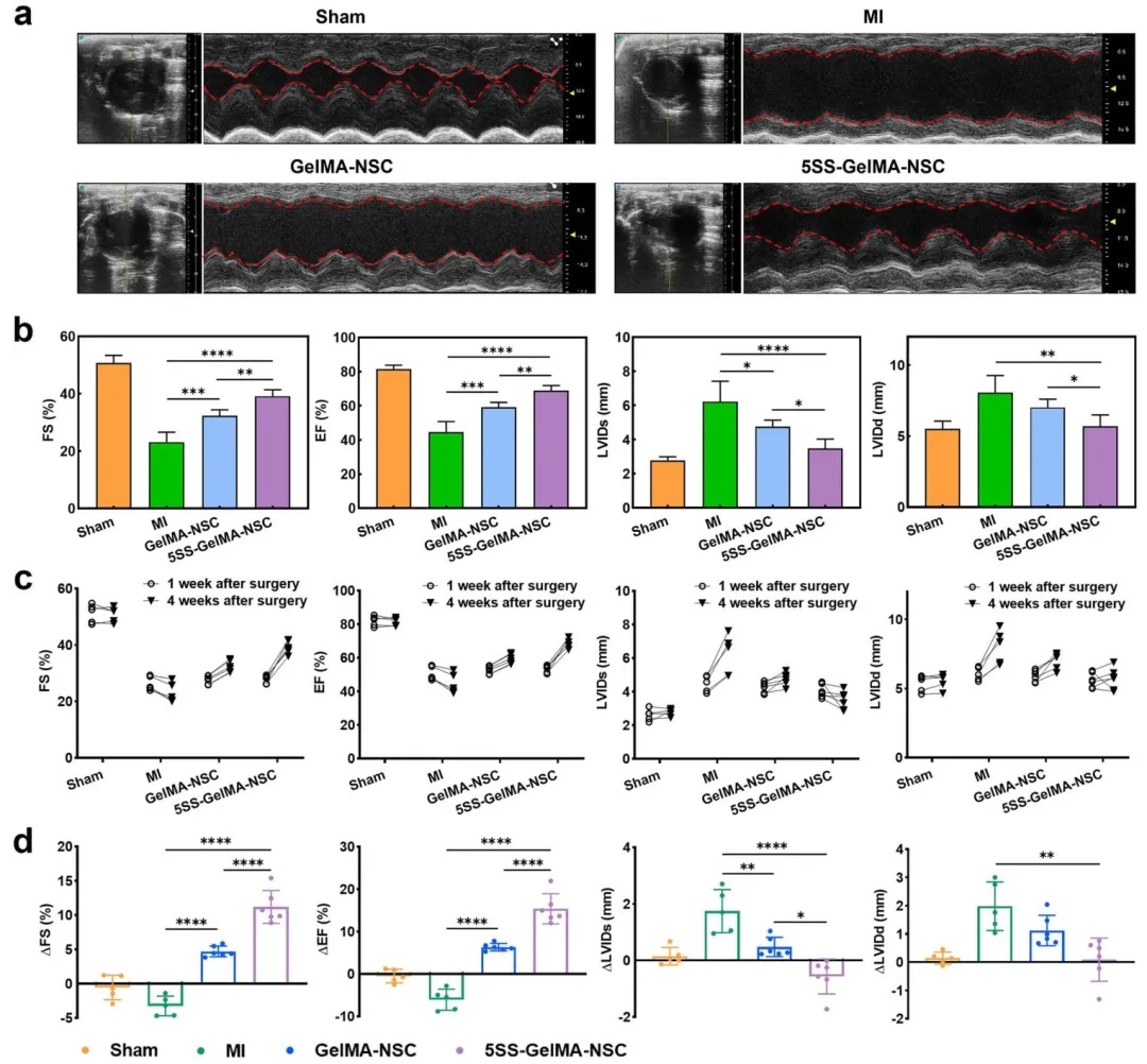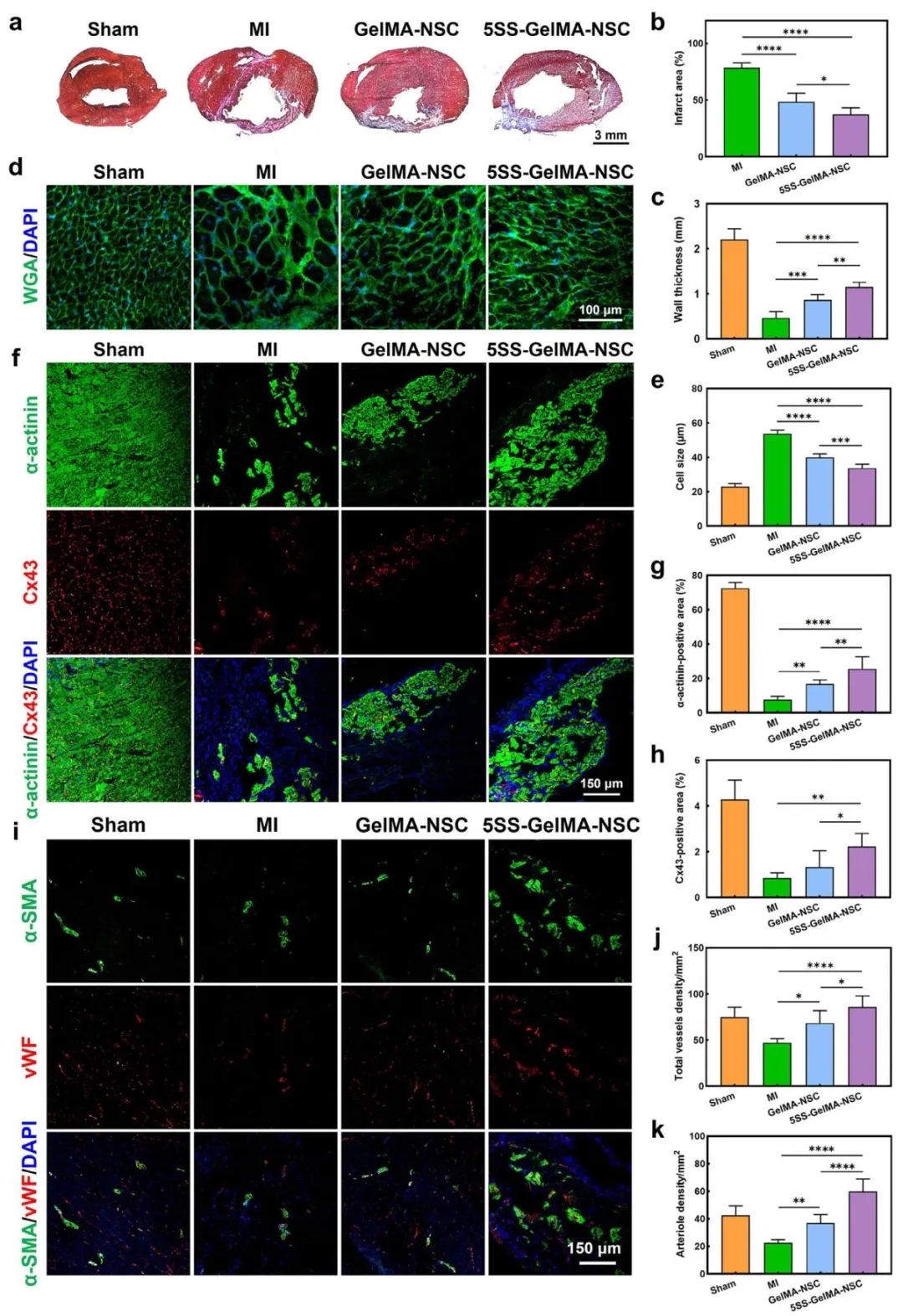 Trichrome、WGA等),评估了支架植入后的心脏功能及组织修复。结果表明,5SS-GelMA-NSC组大鼠左心室射血分数(EF)和缩短分数(FS)显著提升,梗死面积减少,心肌细胞肥大减轻,且促进血管新生(vWF+和α-SMA+血管密度增加)。