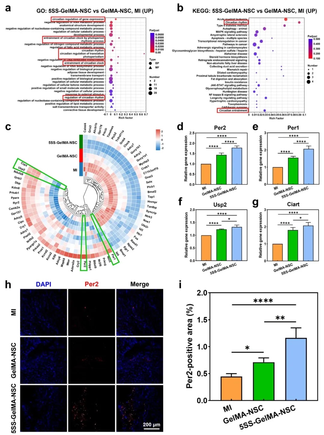 预神经化支架的修复机制,通过转录组测序和基因表达验证,分析了支架诱导心肌修复的分子通路。结果显示,5SS-GelMA-NSC激活昼夜节律相关基因(Per2、Per1、Usp2、Ciart),其中Per2蛋白表达显著升高,可能通过调节炎症反应和血管生成促进心肌修复。