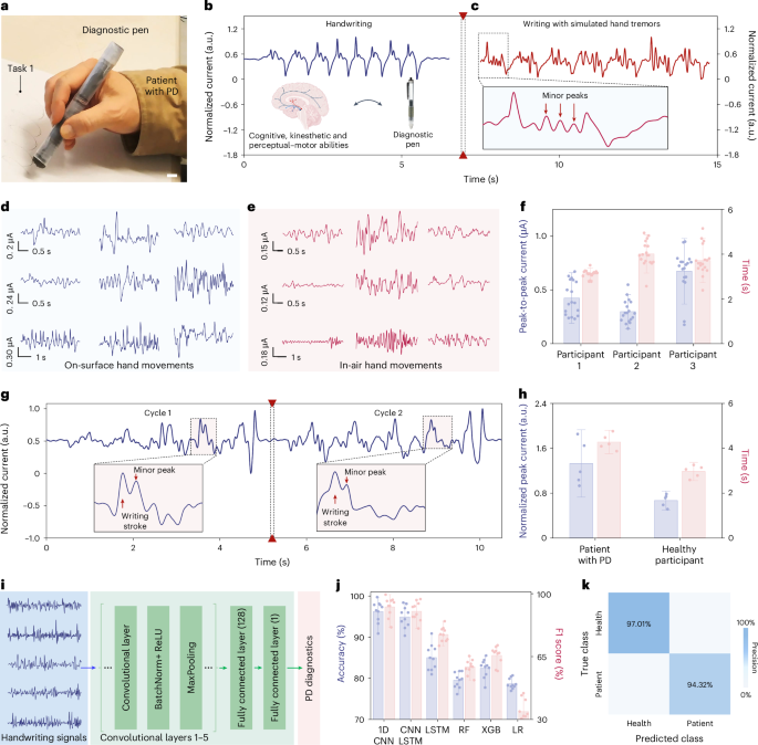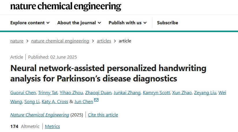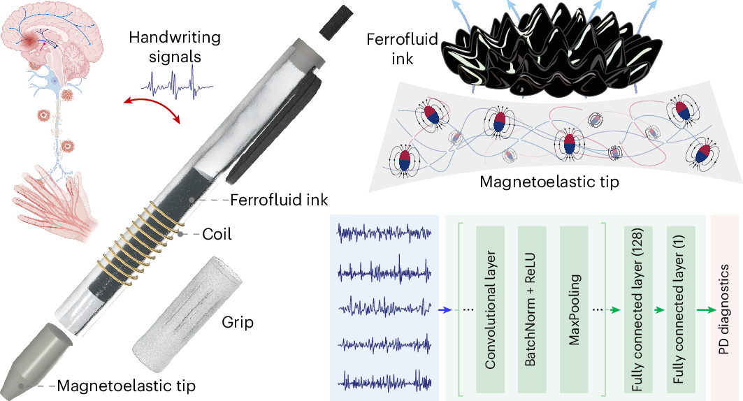 2025年6月4日,加州大学洛杉矶分校(UCLA)的研究人员发明了一支 3D 打印笔,可以检测笔迹中的细微震颤,为诊断帕金森病提供了潜在的工具。整体装置由陈俊教授领导开发,依靠磁性粒子和电信号记录与神经退行性疾病相关的细微运动。陈教授解释说,这支笔通过测量书写时产生的电信号来量化书写过程中的震颤。研究团队的成果以题为“Neural network-assistedpersonalized handwriting analysis for Parkinson’s disease diagnostics”的论文发表在《自然化学工程》杂志上。