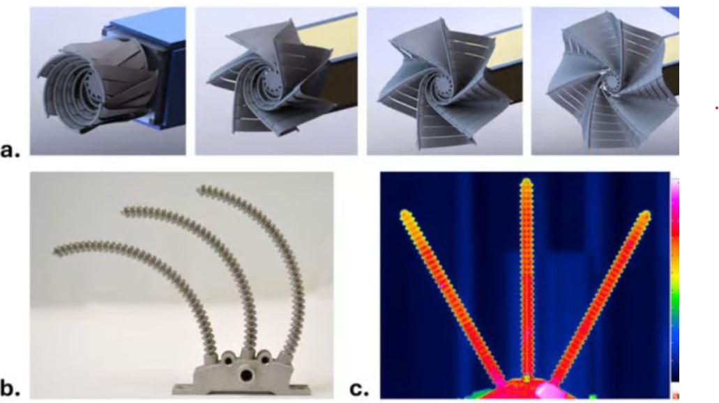 △a. 增材制造形状记忆合金 (SMA) 散热器概念图,其径向热管分支可从紧凑的收纳状态展开;b. 带有高柔顺性波纹管热管臂的 SMA 原型演示器;c. SMA 分支波纹管热管的热图像,显示工作状态接近等温。图片由宾夕法尼亚州立大学提供。
