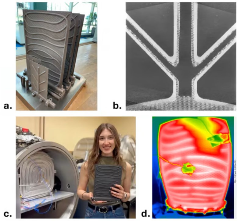 △a. 增材制造的高温钛合金热辐射器原型,内嵌分支热管网络(75×125 毫米和