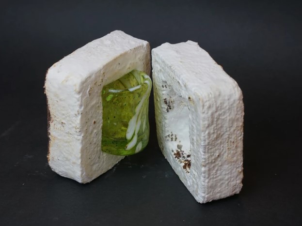 △3D打印包装,类似泡沫塑料,由Mycofluid膏体制成。它的作用是隐藏和保护内部的玻璃结构。